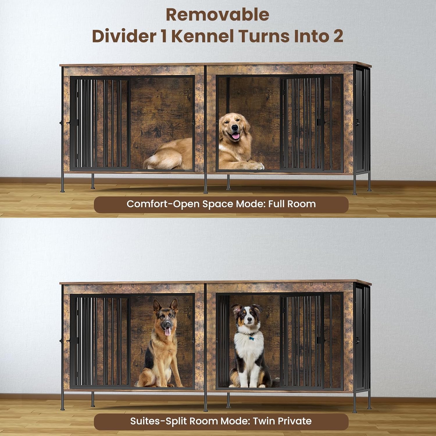 - Room for Two Large Dogs: At 78"L Γ 27.5"W Γ 33"H, this TimberAura dog crate furniture offers two roomy dens so Golden Retrievers or German Shepherds can lie flat and turn comfortably. The built-in center divider creates two separate dens, giving each dog its own space and helping reduce stress during feeding or rest.