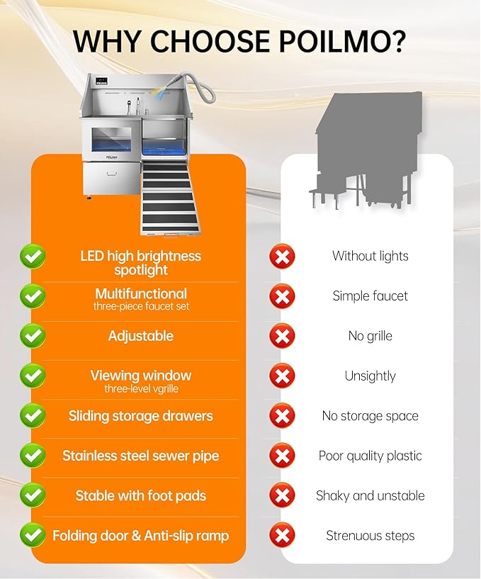 - Premium Stainless Steel Build & Smart Design : Crafted from rust-resistant 304 stainless steel with a full-welded, leak-proof structure, this dog tub is built to last. It features a Grade-A tempered glass viewing window (Eases pet anxiety); A foldable ramp (For easy access, especially for senior dogs); A removable two-piece floor grate (3 height adjustments for large, medium, and small dogs); And a sliding storage drawer (Keeps grooming tools organized). Every detail is designed for a more professional, comfortable, and efficient dog shower tub experience
