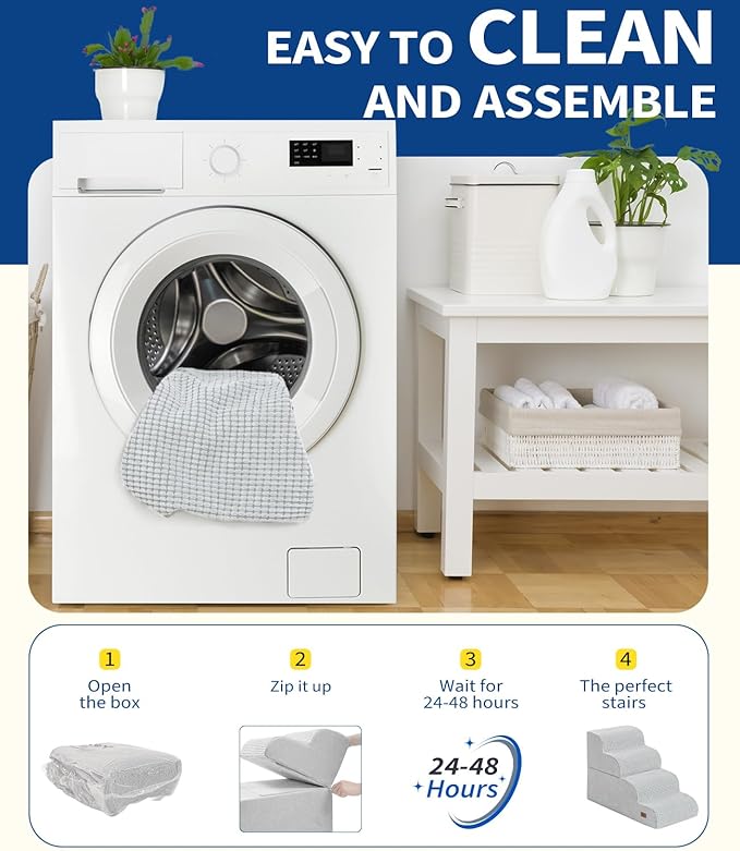 - Easy to Clean - The dog stairs feature a removable, machine washable cover for effortless cleaning. Using without assemble, our pet stairs provide a safe and convenient way for your furry friend to access higher surfaces without the risk of injury or strain on their joints