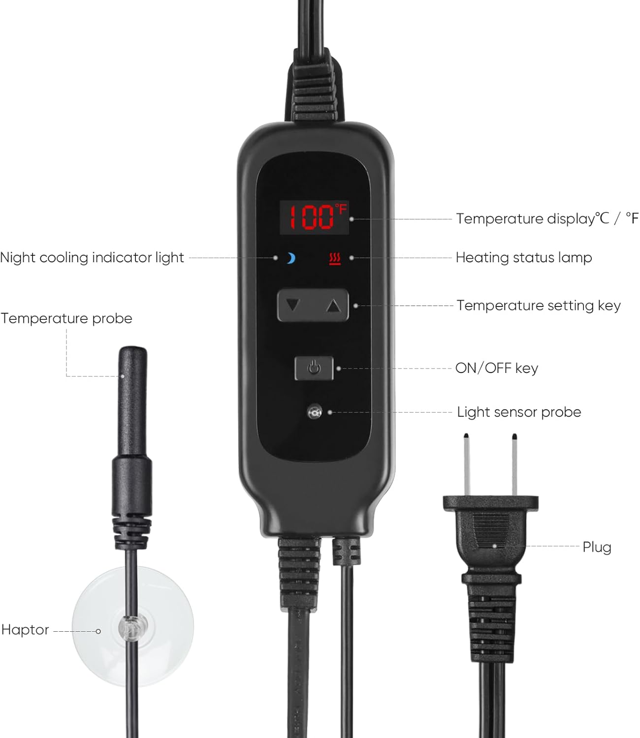 - Easy to Use:The temperature controller of this snake heat lamp is easy to operate and simple to set up; just place the temperature probe in the desired location inside the reptile terrarium, plug in the power, and set the temperature. This reptile lamp fixture with thermostat set is perfect for bearded dragons, lizards, chicks, turtles, hermit crabs, frogs, snakes, leopard geckos, ball pythons, and other reptiles and amphibians.