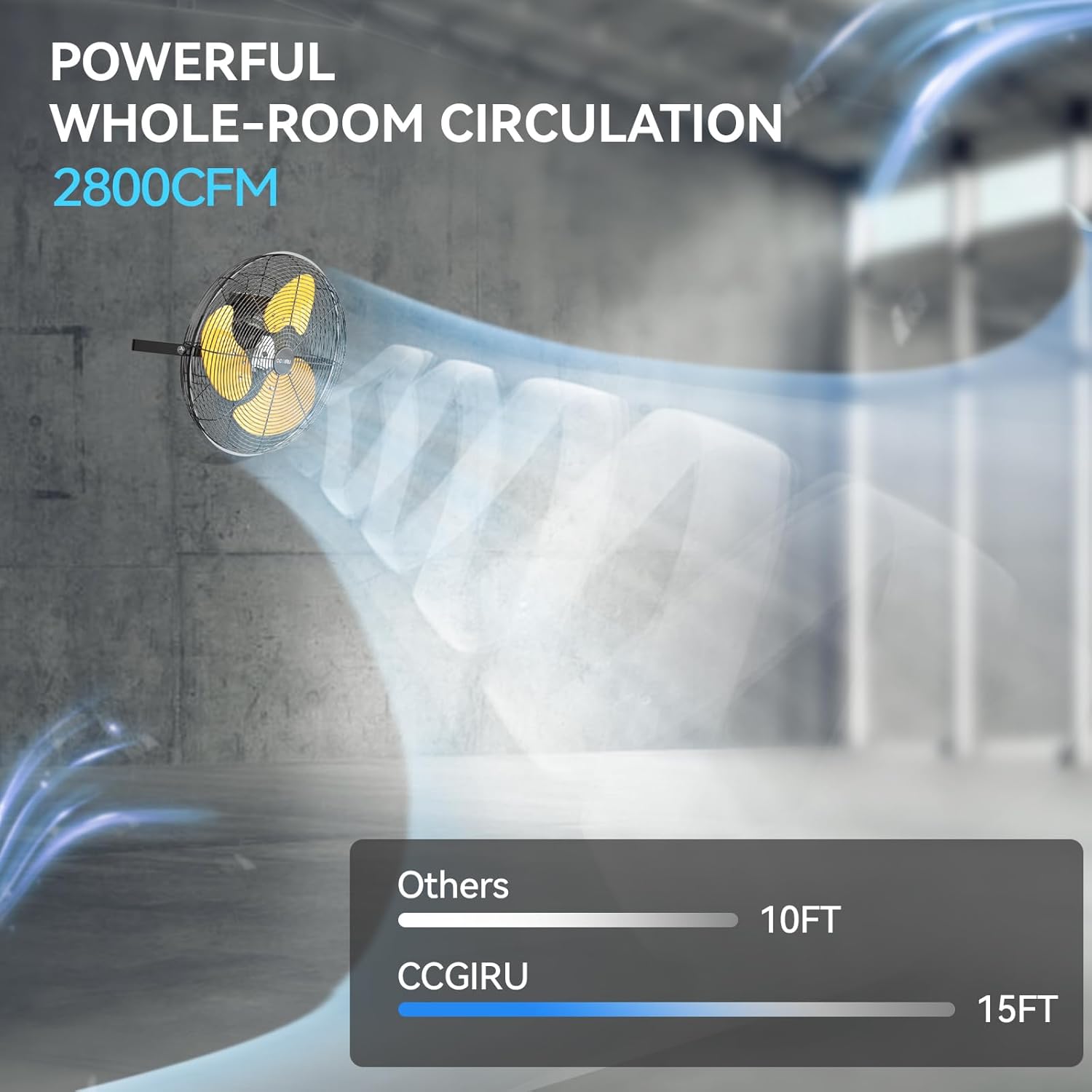 - Longer Airflow: Due to the new tech, CCGIRU's high-velocity industrial wall fan delivers longer airflow. In high speed, the blowing distance reach to 15 ft, the air speed even up to 28.21 ft/s