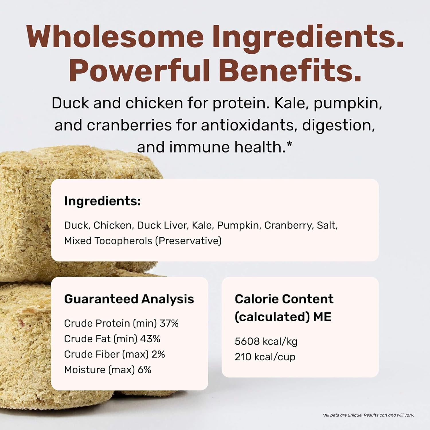 - Nutrient-Rich Freeze-Dried Formula: Made with protein-packed duck, chicken and chicken liver, plus nutrient-dense fruits and vegetables β all freeze-dried raw to help preserve flavor and nutrition in every bite.