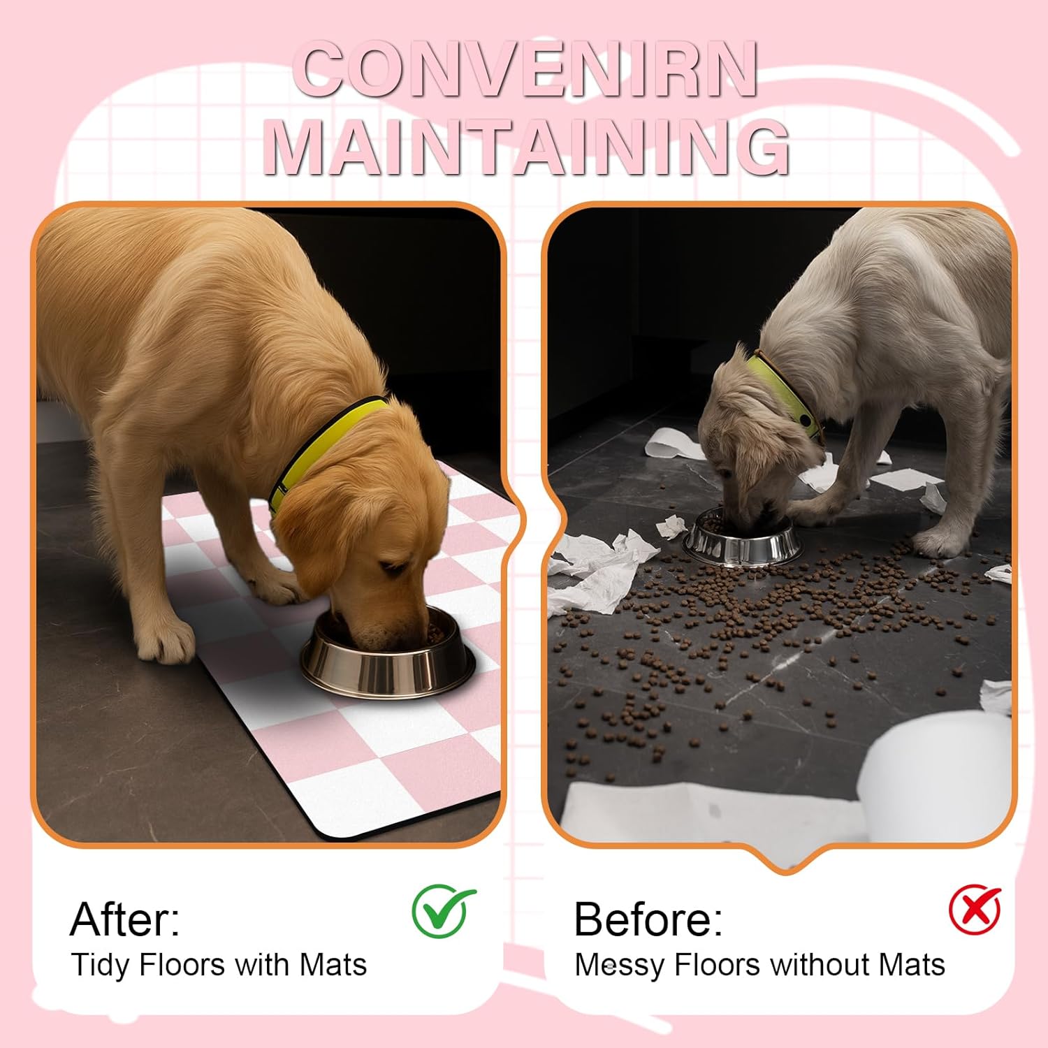 - Absorben & Ultra Easy Cleaning Pet Bowl Mat: Say goodbye to messy floors! Our waterproof water bowl mat with vegan leather surface and sponge layer catches of food spills and water splashes. Simply wipe with a damp cloth - making feeding time more manageable, no longer have to deal with spills and messes on the floor