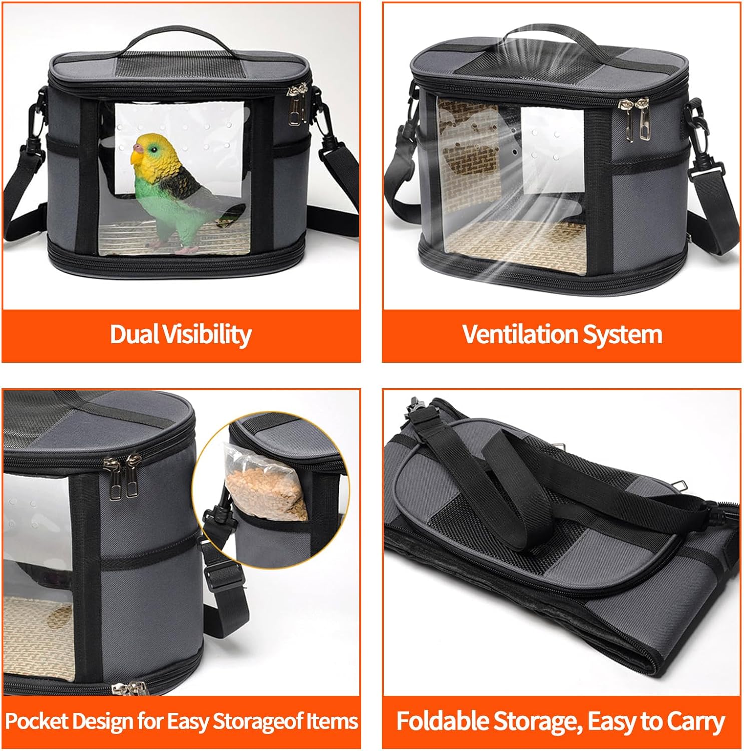 - [ Convenient Food Storage ] : With its concealed pocket, the Bird Carrier simplifies storing and accessing pet food anytime, offering both practicality and a tidy look for enhanced convenience.