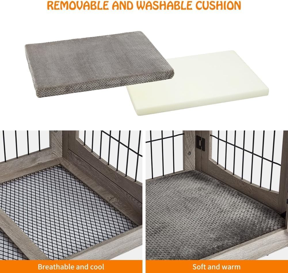 - πγSturdy and Bite-ResistantγThis wooden dog crate furniture is made with high-quality wood and 5mm steel fencing. The sturdy wood and iron construction enhances bite resistance, providing comfort, durability, and easy maintenance. It also features a door stop for added security, preventing your dog from escaping. The wooden base provides stable support and protects your dog's feet from injury.