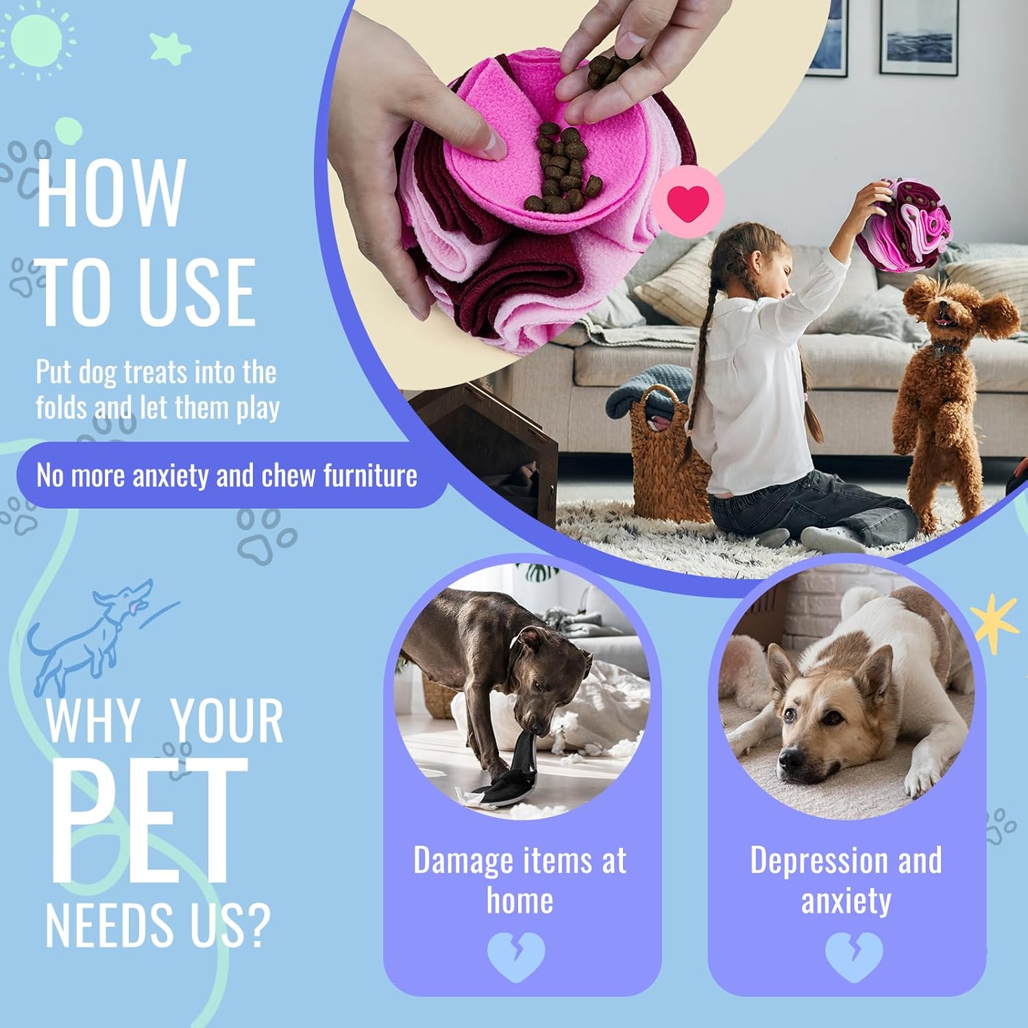 - 🐶Accompany your pets 🐶 We are a family, while your pets accompany you, our Larimuer snuffle balls also accompany them. Our snuff balls are made of high-quality, odorless polar fleece material, taking care of your pet's health.