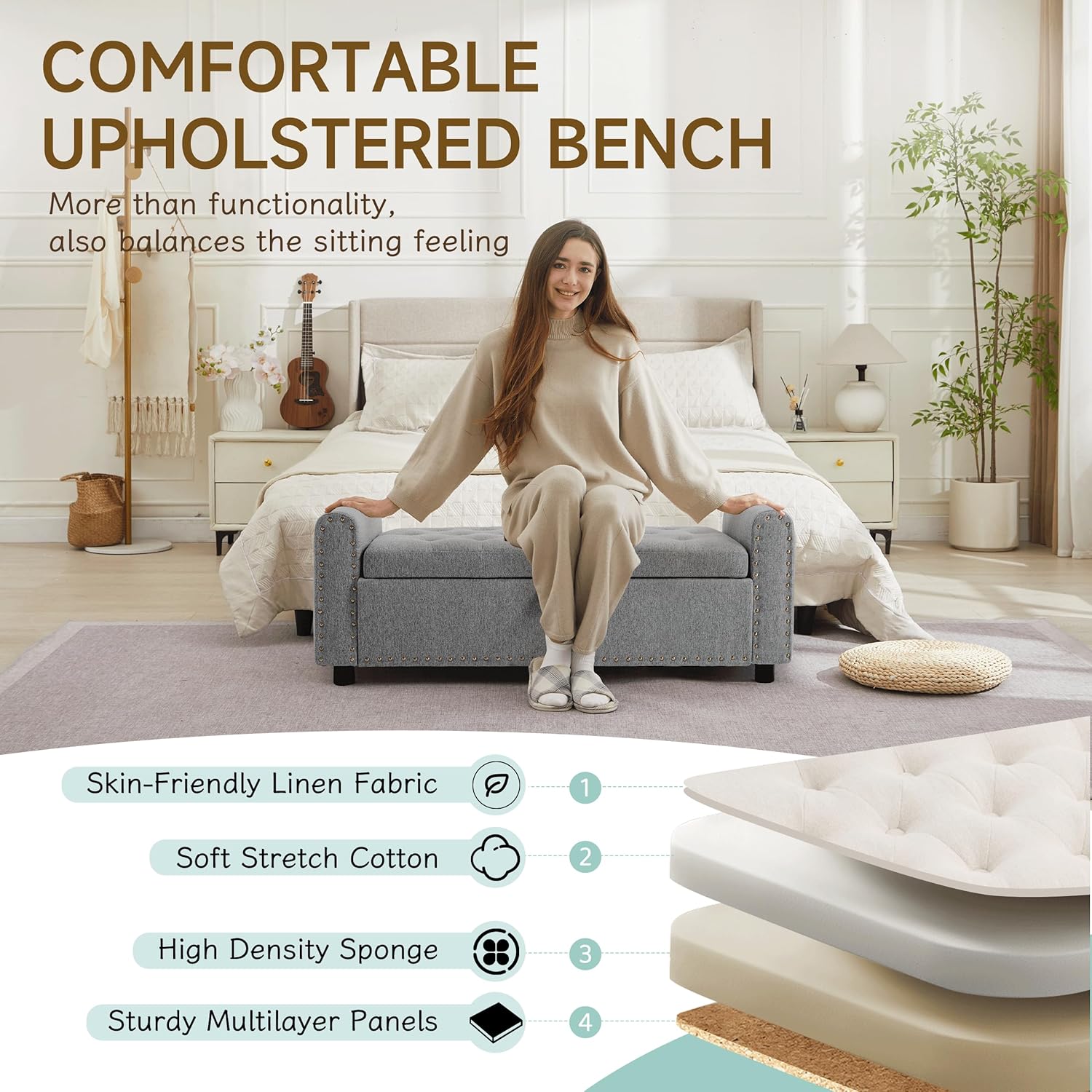 - 𝐁𝐮𝐢𝐥𝐭 𝐭𝐨 𝐋𝐚𝐬𝐭 𝐰𝐢𝐭𝐡 𝐒𝐚𝐟𝐞 𝐒𝐥𝐨𝐰-𝐂𝐥𝐨𝐬𝐞 𝐇𝐢𝐧𝐠𝐞𝐬-Crafted with sturdy frame and base, this upholstered bench provides reliable support for seating up to 330 lbs. The slow-close hinges prevent the lid from closing suddenly—perfect for households with pets. The smooth, quiet mechanism also prevents wear over time. Whether you're sitting, storing, or just admiring its beauty, you can count on this bench to deliver lasting comfort, safety, and stability with long use.