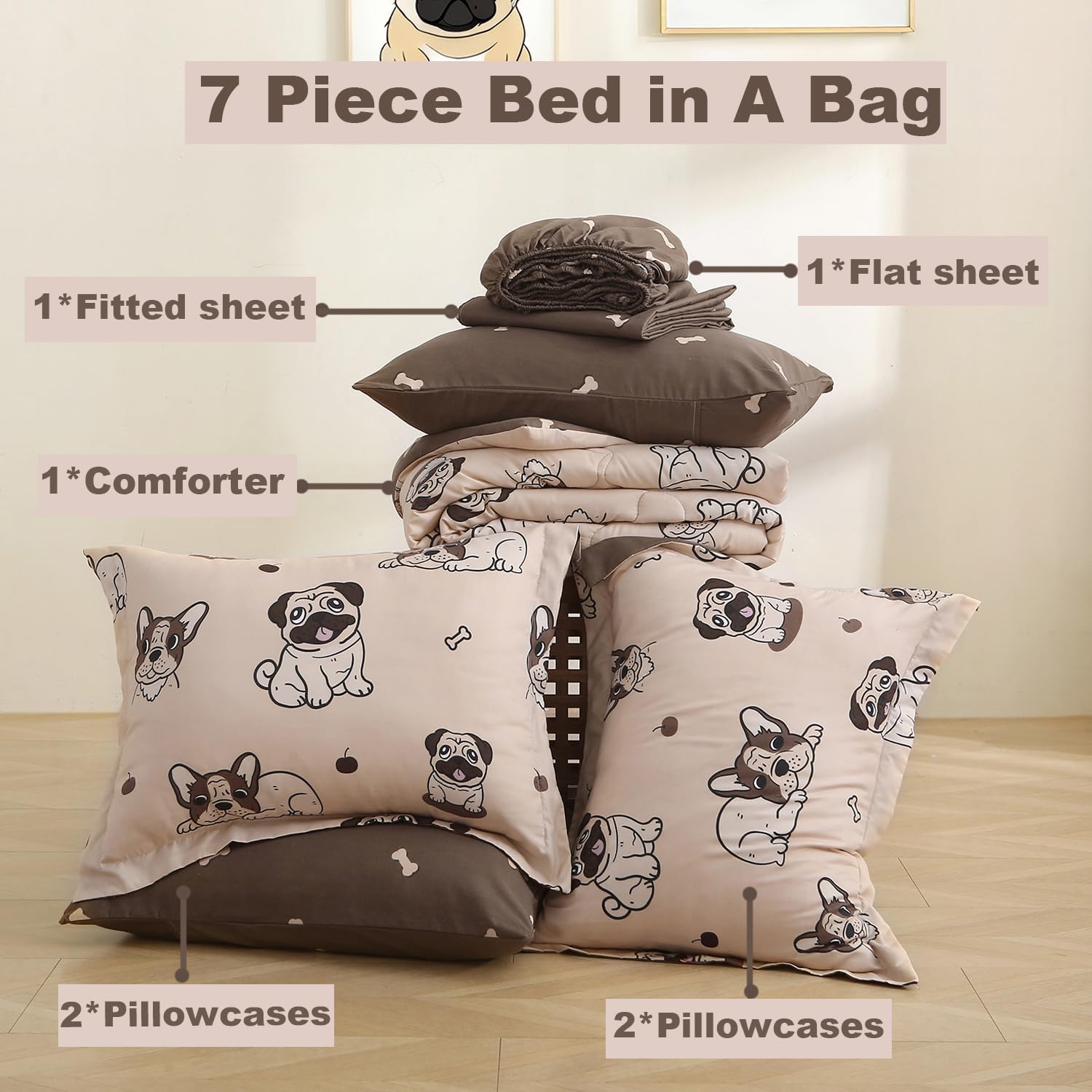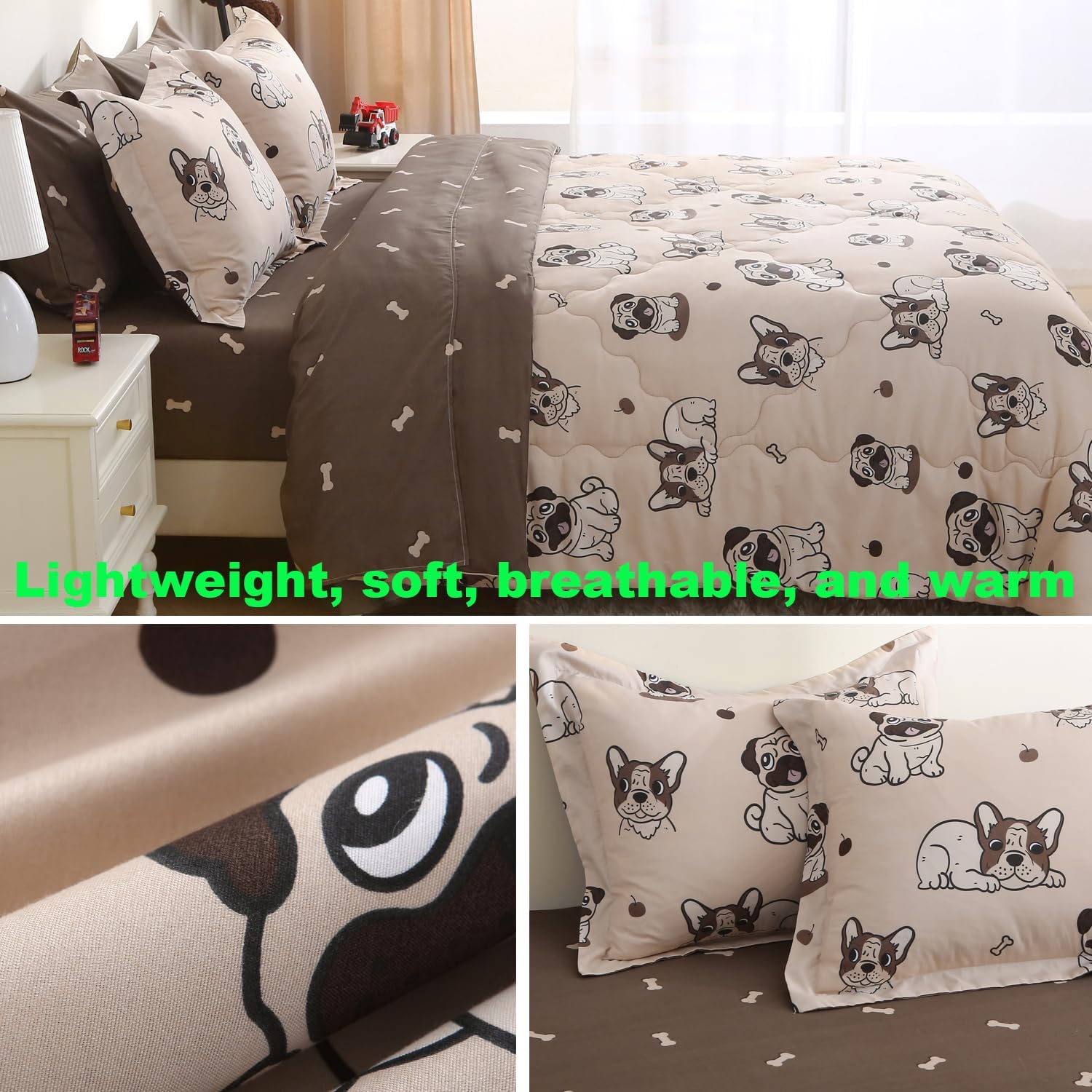 - 7 Piece Kids Comforter Set Included : 1 dog full comforter 80 inch x 90 inch + 2 standard pillowcases 20 inch x 26 inch - 1 full size fitted sheet 54 inch x 75 inch - 1 full size flat sheet 80 inch x 96 inch -2 standard pillowcase 20 inch x 26 inch