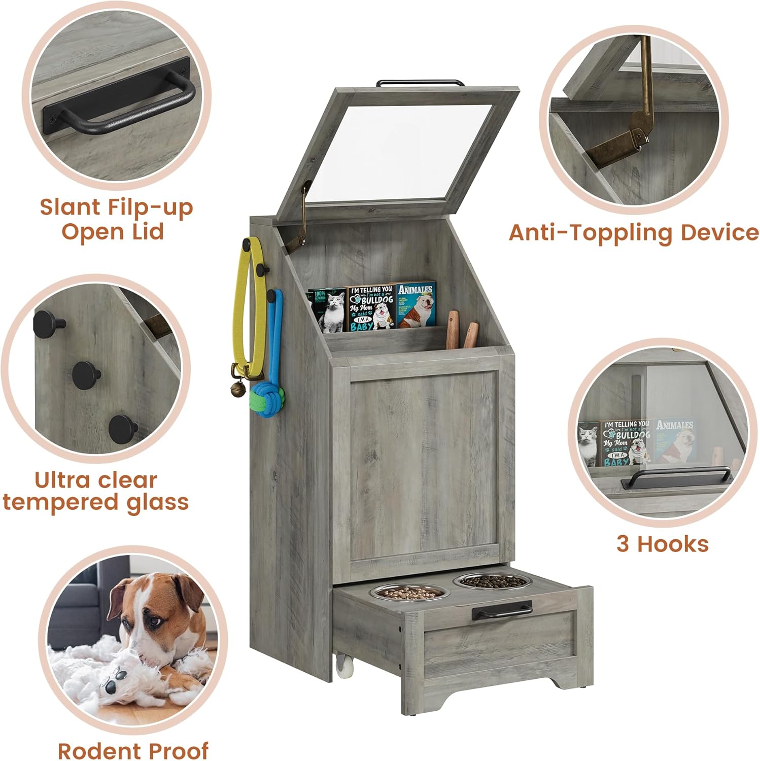 Dog Feeding Station with Storage - Large Capacity Dog Food Storage Cabinet with 2 Removable Stainless Steel Bowls, Flip Top Pet Food Container Toy Storage Organizer - Grey