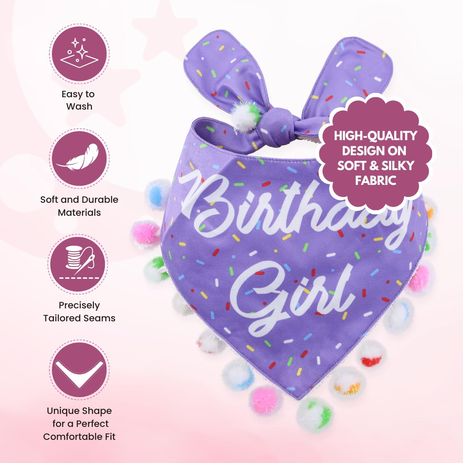 LunaMarie - Luxury Pet Birthday Bandanas -Premium & Silky Poly Fabric | 100% Handmade | Custom Shape Dual Layered (Birthday Girl Purple, Small)