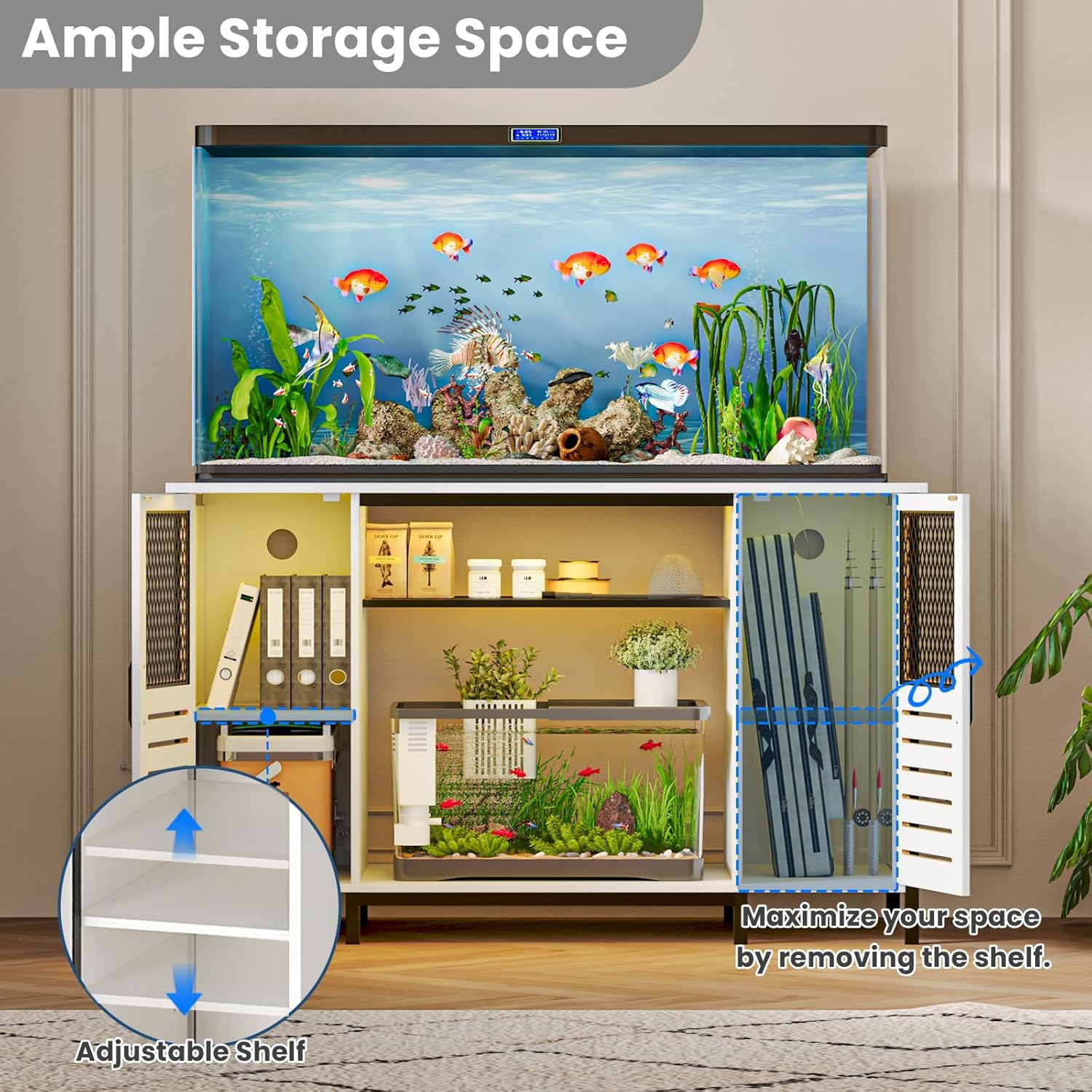 - 【Flexible Storage】The fish tank stand open base section accommodates 10-15 gallon aquariums, while the middle metal shelf organizes fish food and cleaning tools. Dual cabinets feature adjustable shelves that adapt to item heights,stack small supplies or remove shelves to easily store tall items, meeting all your storage needs.