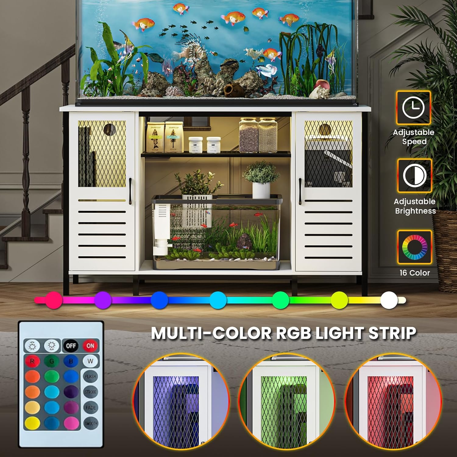 - 【Vibrant LED Strip Light】The aquarium stand features a built-in LED strip light with 16 colors and 4 dynamic modes. Using the included remote control, you can freely adjust the color and flashing frequency. Illuminating with soft light at night not only instantly enhances the visual appeal of your aquarium but also creates a sophisticated and dreamlike ambiance in your living room or study.